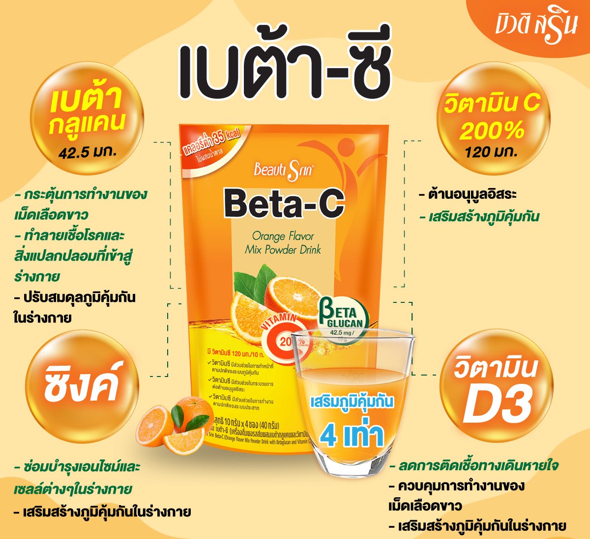 Beta-C (เบต้าซี ) เครื่องดื่มผง ที่มีมากกว่า ด้วย 4 สารสกัด ที่เราคัดสรรมาอย่างดี ทั้ง วิตามินซี ซิงค์ วิตามินดี 3 และที่สำคัญมี Beta Glucan (เบต้ากลูแคน) ที่จะเข้ามาช่วยเสริมสร้างภูมิคุ้มกันให้ร่างกาย ป้องกันการติดเชื้อ ช่วยต้านการอักเสบ ป้องกันระบบทางเดินหายใจ ฟื้นฟูและบำรุงเม็ดเลือดขาวให้ทำงานดีขึ้น ช่วยกำจัดเซลล์อันตรายในร่างกาย ป้องกันและลดอาการภูมิแพ้ ช่วยต้านอนุมูลอิสระ และบรรเทาหวัด