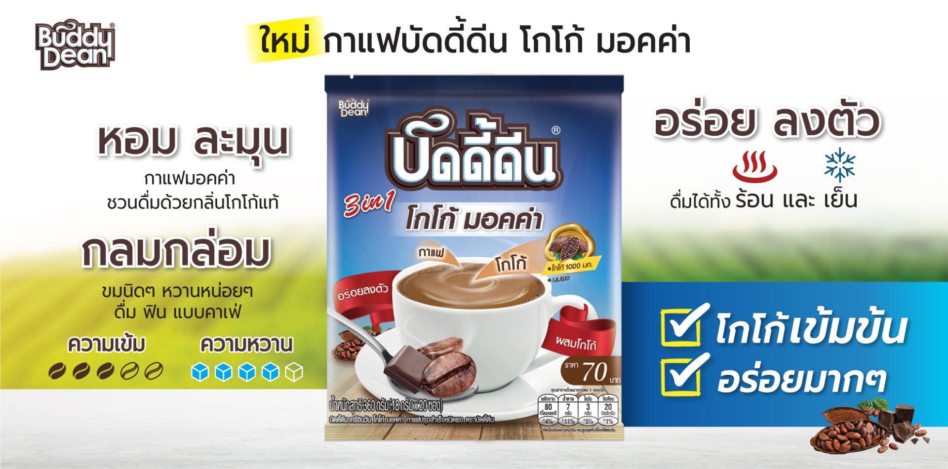 หากอยากลิ้มลอง กาแฟมอคค่า แบบไม่ยุ่งยาก บัดดี้ดีนก็มีให้เลือกดื่มอย่างบัดดี้ดีน 3in1 โกโก้มอคค่า หอม อร่อย กลมกล่อม ผสมผสานกันอย่างลงตัวของกาแฟคั่วเข้มโรบัสต้า และผงโกโก้พรีเมียมนำเข้าจากต่างประเทศ